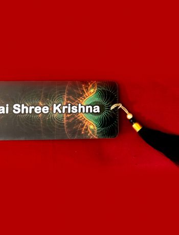 A bookmark with ‘Jai Shri Krishna’ written on one side and a 12 cms measure scale on another side.