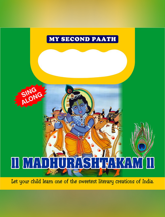 A book with a ‘handle’ which your child would love to grasp and roam in the house. The pages of this book have the Madhurashtak written in bold and large letters. The QR code given at the back of this book plays ‘Adharam Madhuram…’ on a device so the child can listen to the Paath as well.