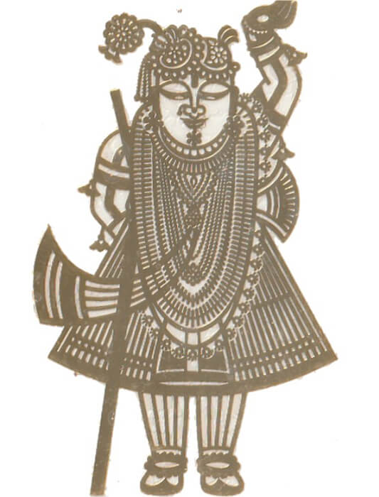 A pair of golden stickers of Shrinathji which can be stuck on the backside of Cell phones or other places like drawers or cupboards.